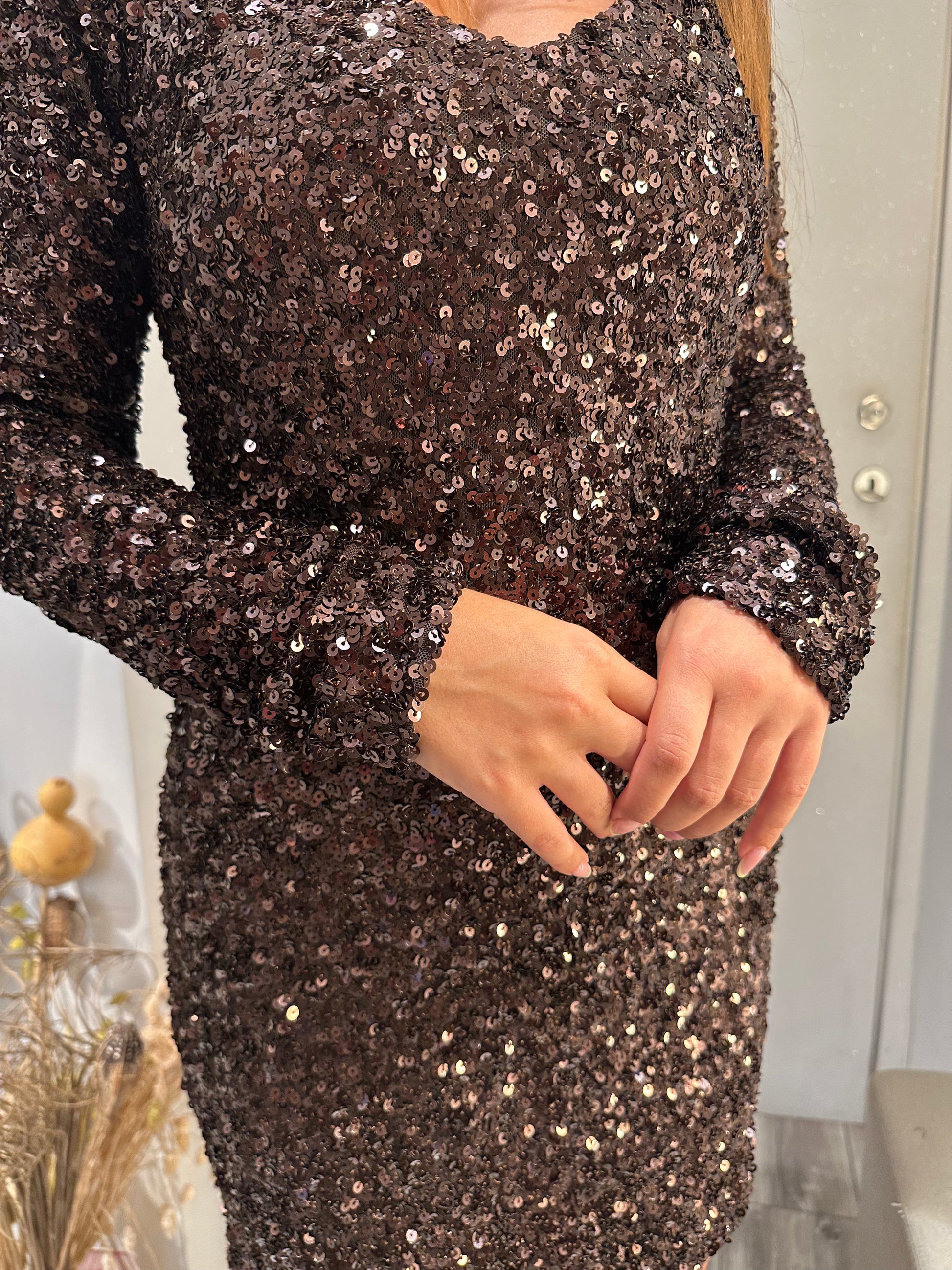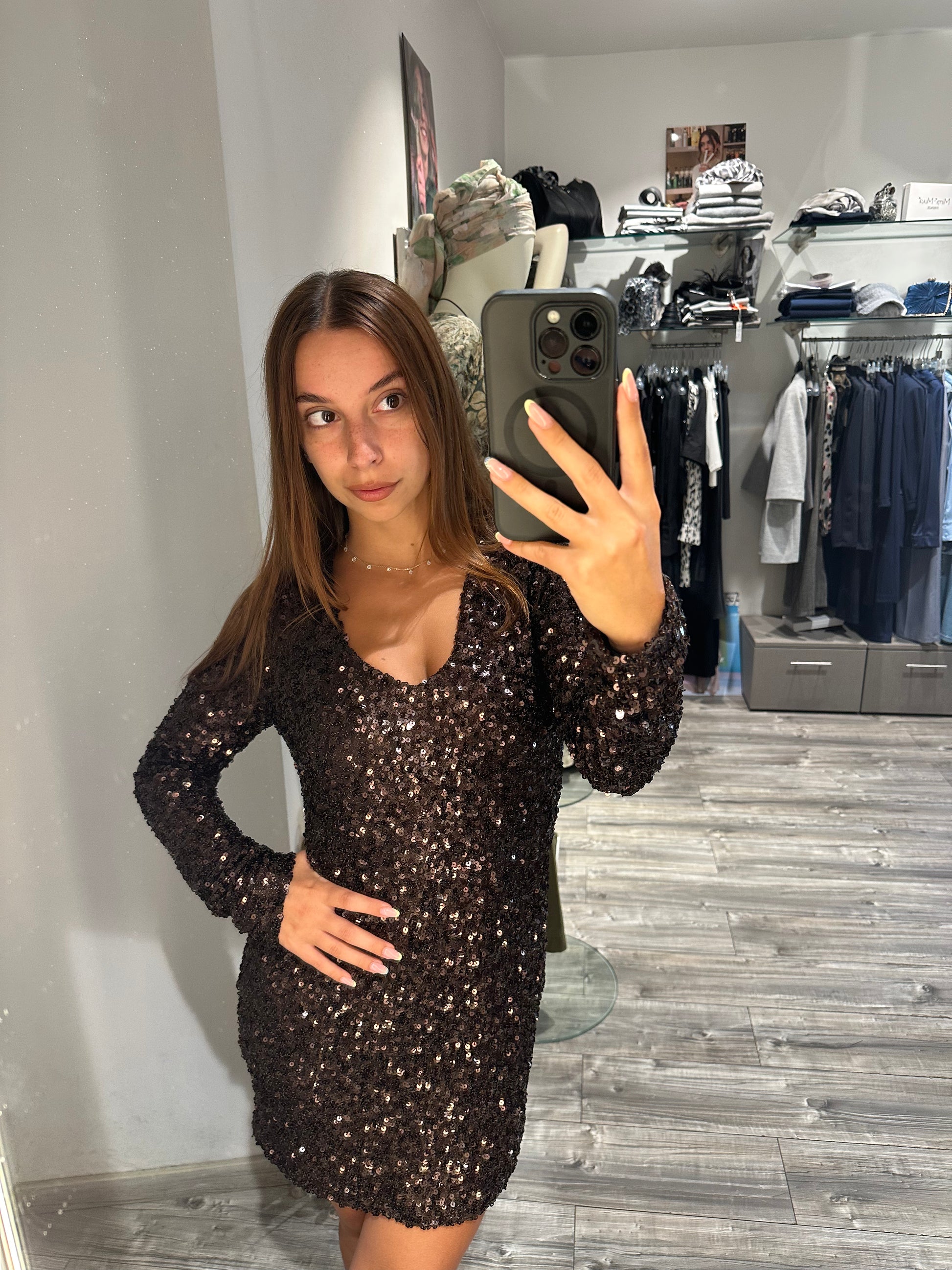 Questo abito corto in paillettes color moro presenta un elegante scollo a V e maniche lunghe, creando un equilibrio perfetto tra seduzione e raffinatezza. Il design avvolgente valorizza la figura, mentre la brillantezza delle paillettes aggiunge un tocco di glamour sofisticato, ideale per eventi serali o occasioni speciali. Un capo distintivo che unisce stile e comfort in modo impeccabile.