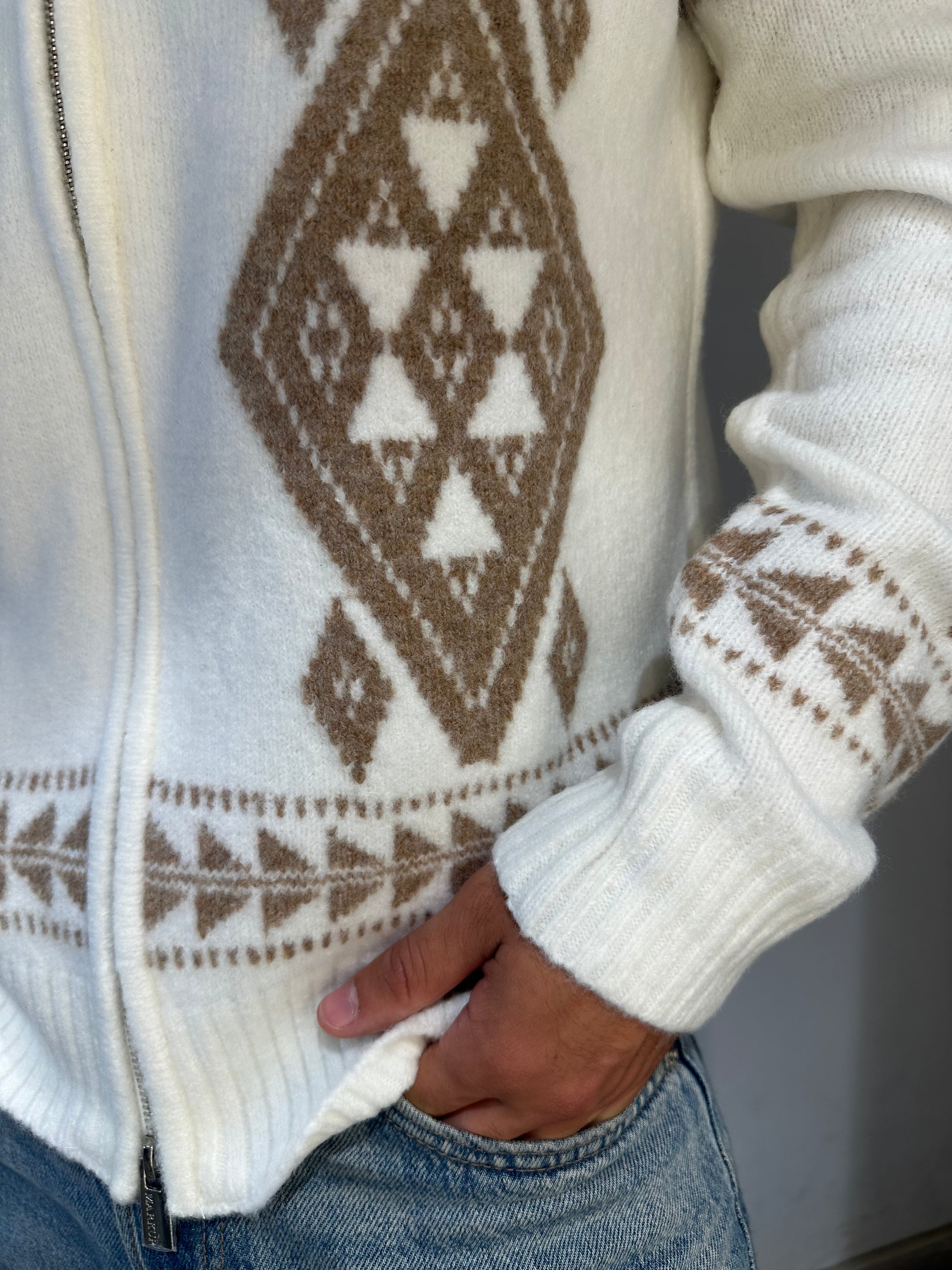 Scopri il cardigan fantasia jacquard color latte con una raffinata fantasia a contrasto cammello. Questo capo, morbido e caldo grazie alla lana presente nella sua fibra, avvolge con comfort e stile. La chiusura full zip facilita la vestibilità e consente di adattarlo facilmente alle temperature più fresche. Perfetto per chi desidera un tocco di eleganza senza rinunciare alla praticità ogni giorno.