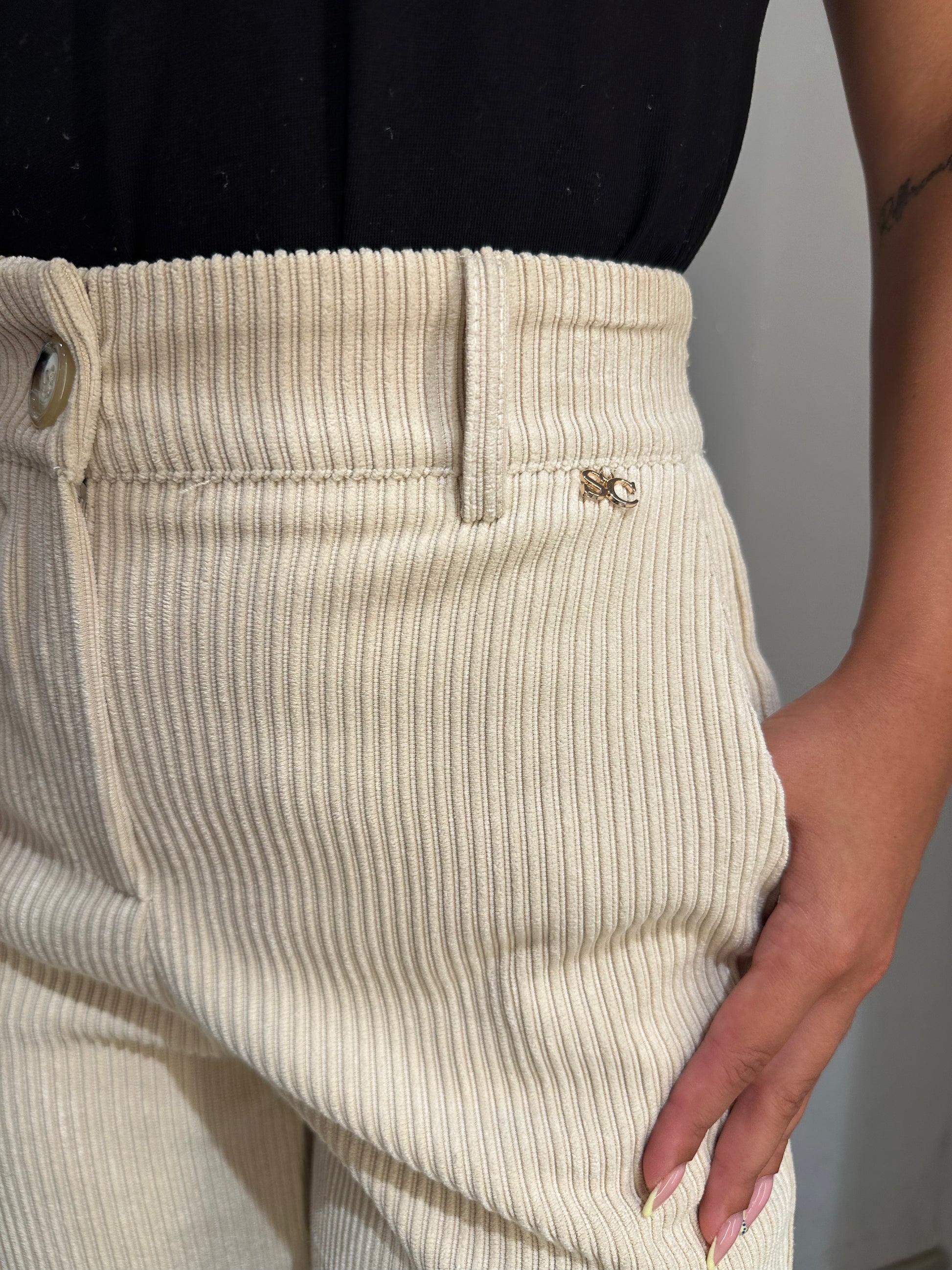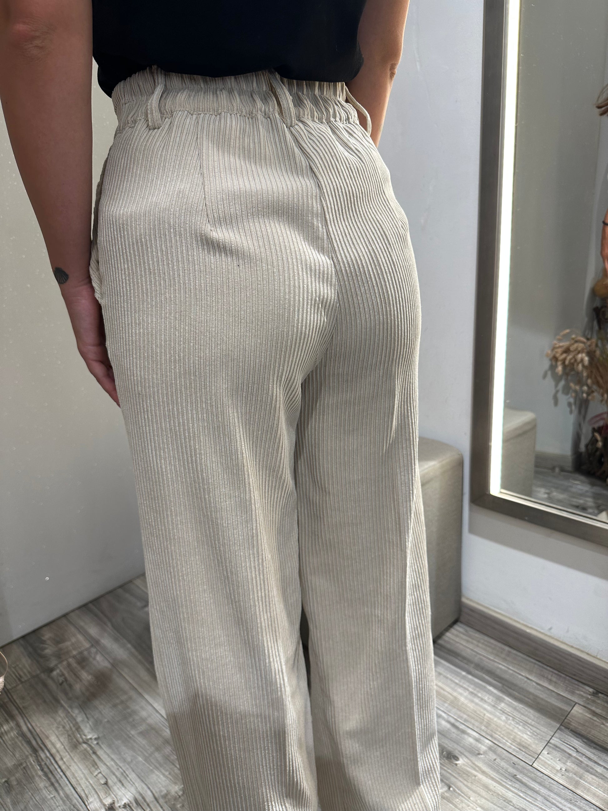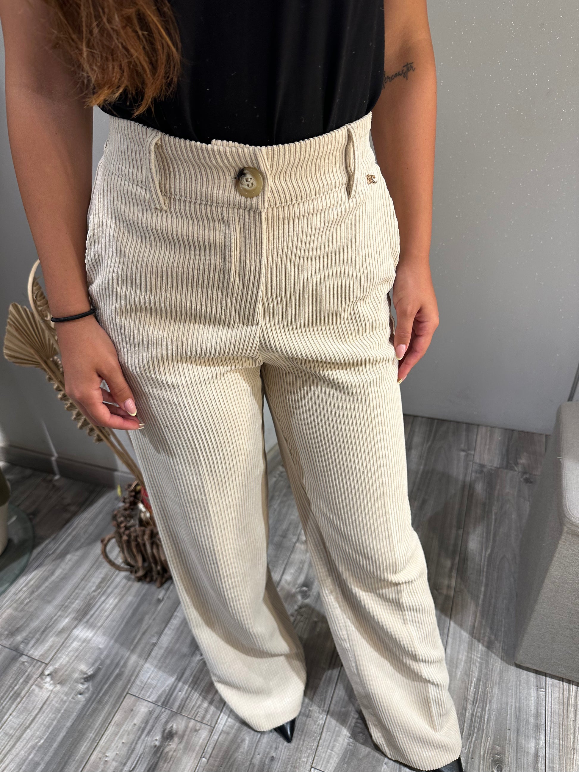 Questo pantalone a palazzo in velluto color gesso offre una vestibilità impeccabile grazie al bottone e alla zip, garantendo comfort e stile raffinato. Perfetti per chi cerca eleganza e praticità in un capo versatile. Disponibile anche in colorazione Nero.